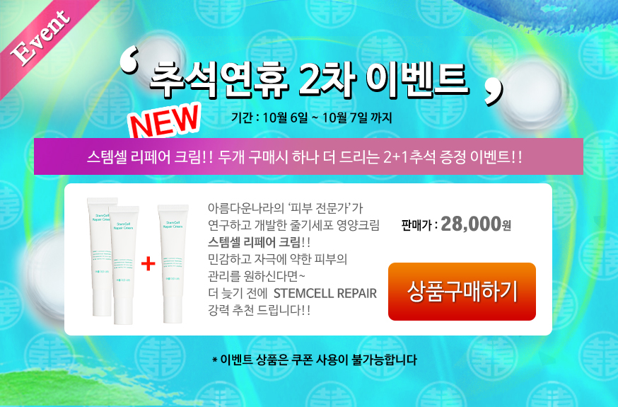 추석연휴 2차 아름다운나라 화장품 스템셀 리페어 크림 2+1 증정 이벤트~!!
